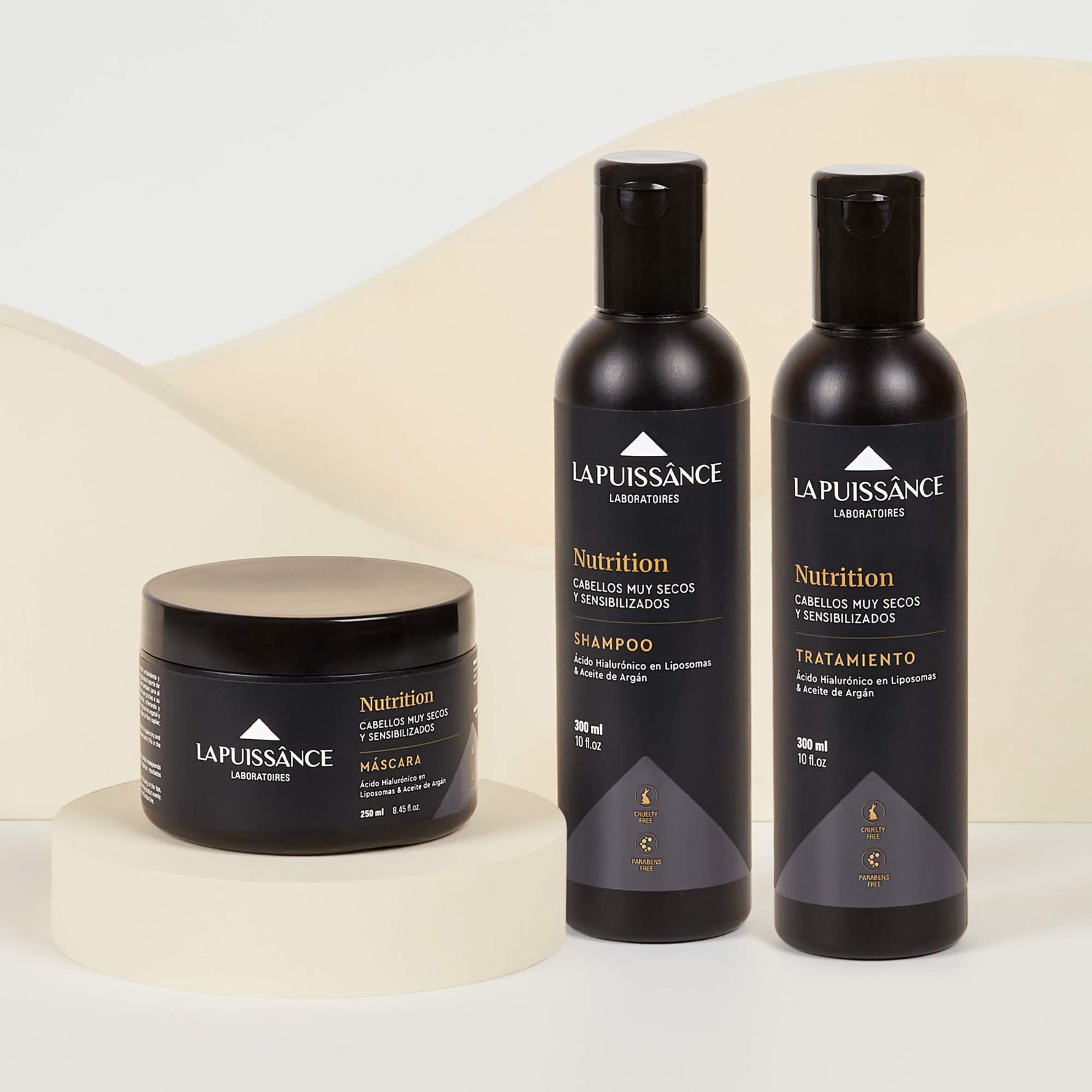 Una rutina completa para nutrir y revitalizar el cabello seco o sensibilizado. Incluye Shampoo, Tratamiento y Máscara Nutrition, formulados con ácido hialurónico y aceite de argán para hidratar, reparar y devolver el brillo desde la primera aplicación.